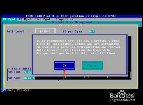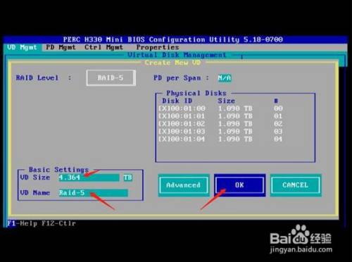 按tab键,调到下一个,手动设置一个VD name(raid-5),这里也看到总的空间大小,然后点击:OK,即保存。如图所示:
