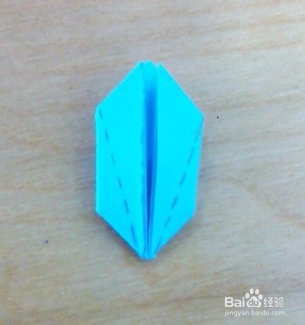 将上一步所折物的第一层按虚线从中间分别向两边翻折,出现两个长的三角形!效果如下!