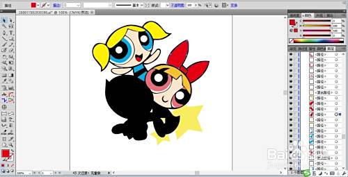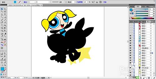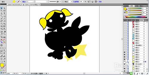 我们用黑色填充小孩的剪影路径,用黄色填充左上角小孩的头发路径。用白色填充眼晴的中心路径。右下角的星星用淡黄色填充。