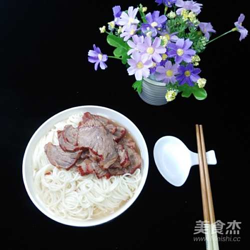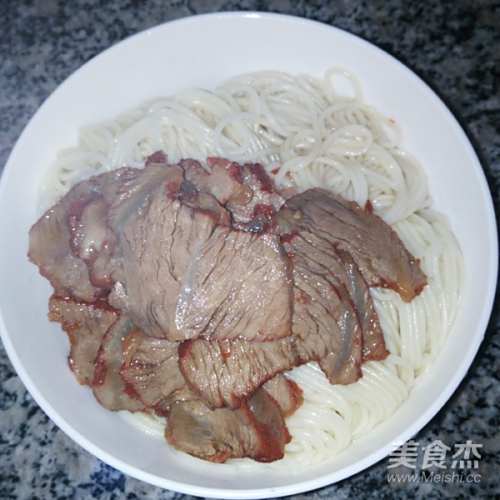 卤牛肉提前解冻,微波转热,连汤汁浇在面上就行了。如果有菜叶或葱什么的更好,我家没有就没放。