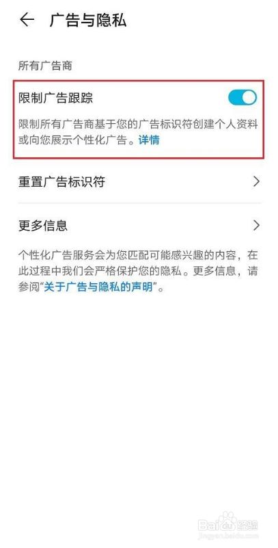 在华为手机中,可以打开设置界面,选择进入隐私界面后将广告与隐私设置为开启限制广告跟踪即可拦截广告。