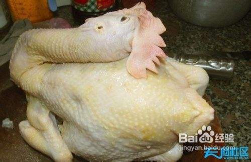 三黄鸡洗干净,去脚,沥干,用消毒过的牙签用来封口,如脖子、鸡屁股有开口的地方封好,以免过多的盐入到鸡内而过咸。