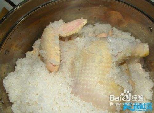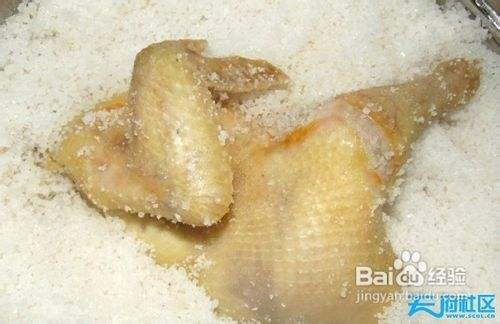 锅底均匀铺上一层粗盐,然后把鸡放在盐上,鸡的部位不能贴到锅,以免焦