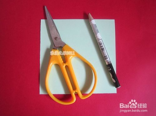 首先准备好折纸材料,一张正方形的纸,一把剪刀,一支笔,如图所示。