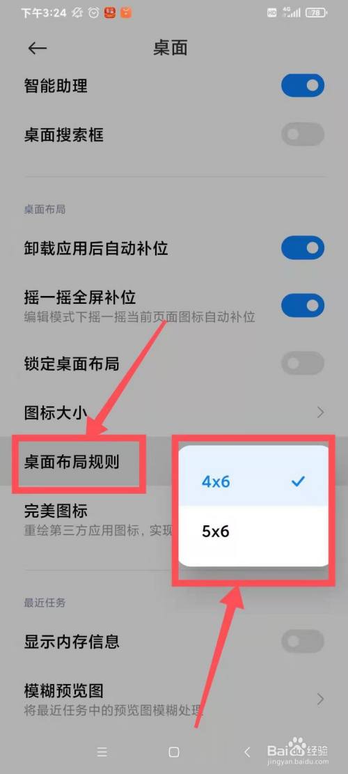 进入“桌面”界面,点击“桌面布局规则”,选择“5×6”,即可完成桌面布局修改。也可以对图标大小进行修改。