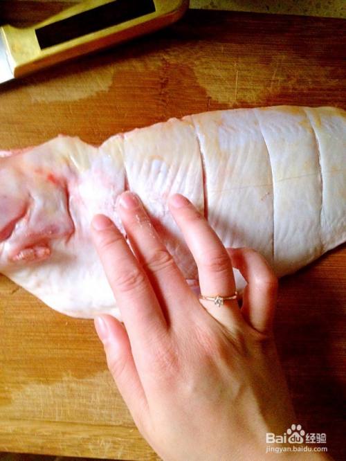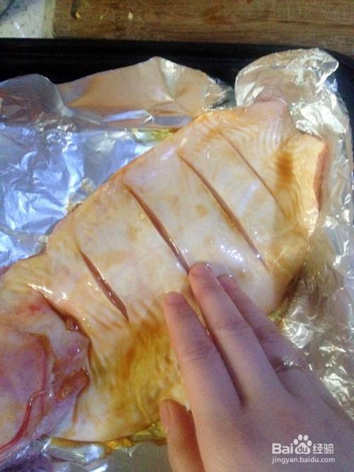 将鱼收拾干净,从背部劈下,不切断,使其摊平。因为我这是试验版,所以只使用了一半的鱼。