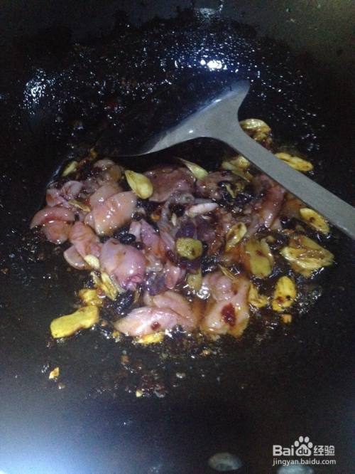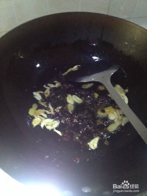 将炸过的材料捞出,只留下花椒油。淋一些花椒油在鱼上。再将姜蒜放入锅内煸炒。