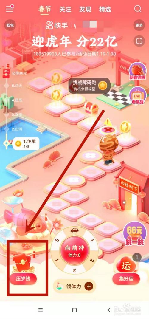 在快手“过虎年 分22亿”活动中,点击进入压岁钱。