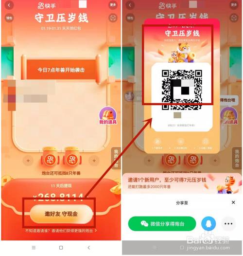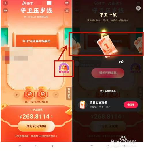 在快手中,进入“压岁钱”活动,通过好友助力以及道具进行抵挡年兽守护现金就可以了。