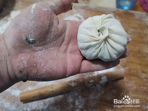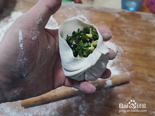 将面剂子压扁,擀成面饼,放上调制好的韭菜木耳鸡蛋馅料