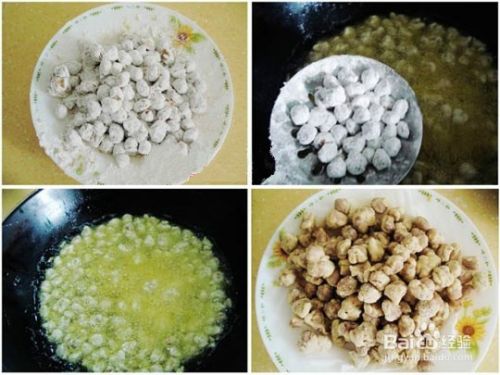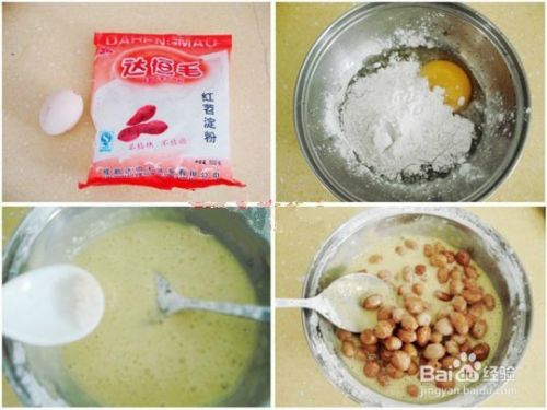 2.用筛子筛去多余的干粉,把花生放入约四成热的油(油冒青烟是差不多5成热)中炸,上色后捞出即可。