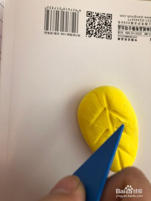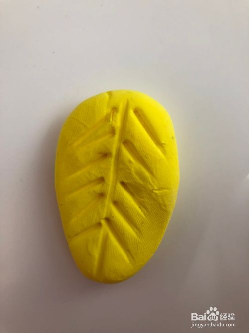 还可已做树叶,先把彩泥揉成圆形,然后弄成椭圆形,按扁,然后用小刀在中间按出一道印形成主脉, 在两边用小刀按出叶脉。
