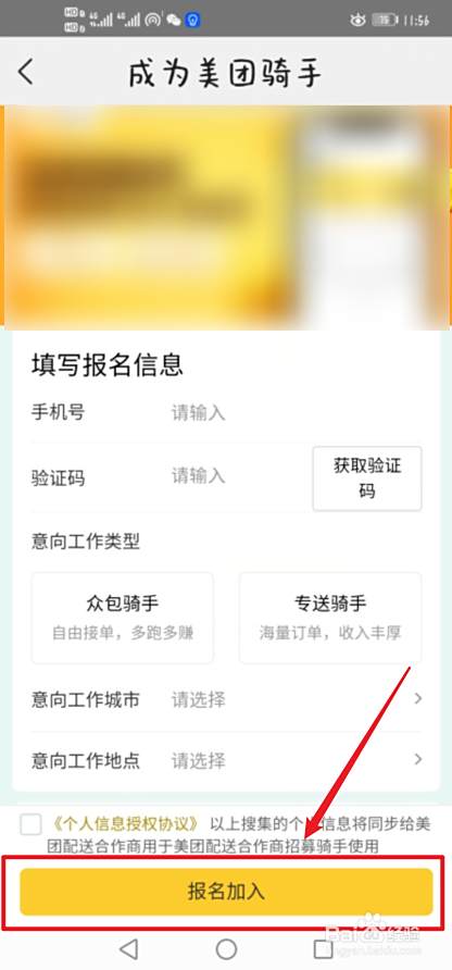 将个人信息完善后,点击【报名加入】就可以加入美团外卖送餐员兼职。