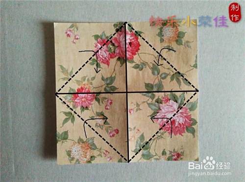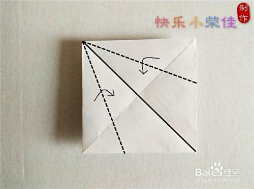 翻过来,相邻两边沿虚线向中间折叠,与对角线对齐。