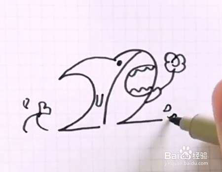画一个大大的“C”当嘴巴,然后用小三角形组成鲨鱼的牙齿。