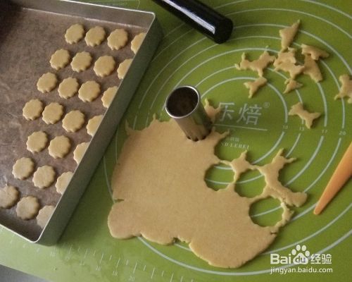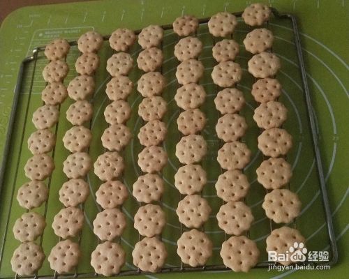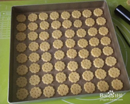 将压好的饼干摆放在烤盘里,在饼干上戳上洞孔,每个饼干之间留有一定距离,防止烘烤时受热粘连在一起