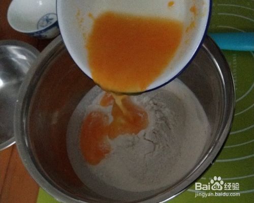 将融化好的蛋奶糖液倒入过筛的低筋面粉里,用刮刀微拌成面絮状
