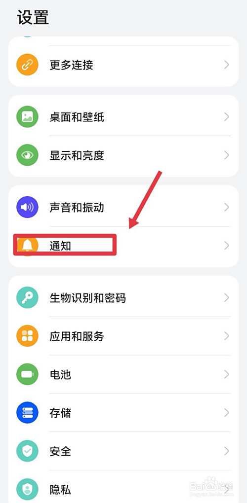 点击进入手机设置,进入设置中心后,向下滑动屏幕找到通知,进入通知页面。