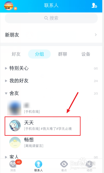 在联系人页面,打开好友分组,点击一名QQ好友。