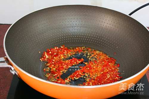 4热锅,倒油,爆香剁椒、蒜末;