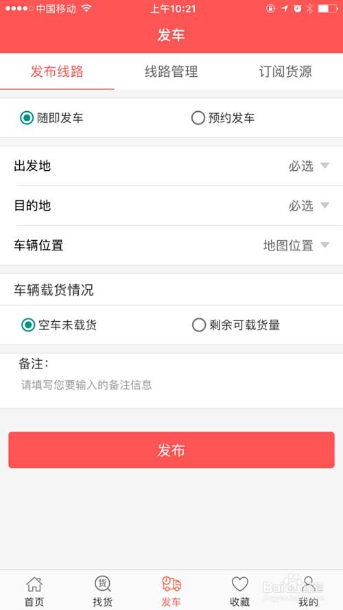 主动发布空车信息,坐等货主找上门。点击“一键发车”还可以进行“线路管理”和“货源订阅”。