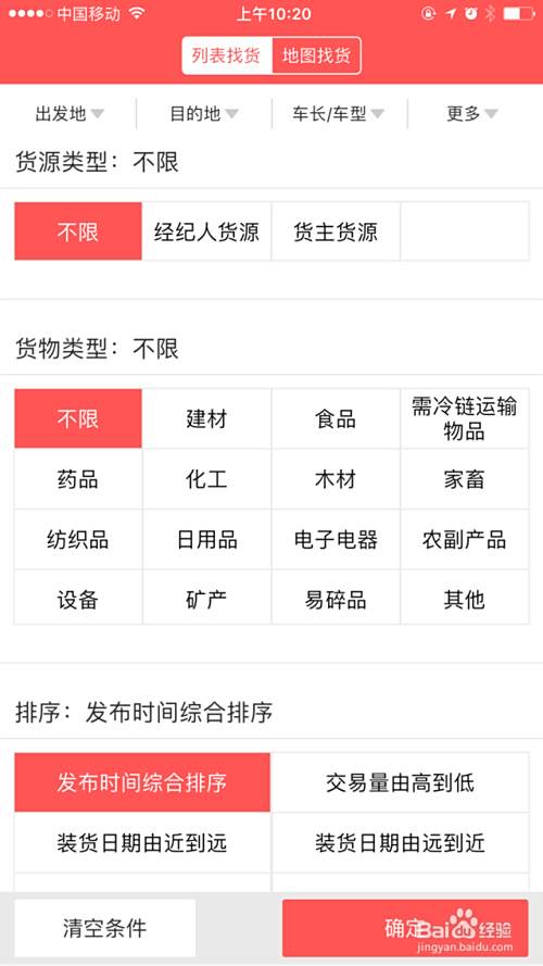 查看货源信息,点击“快速找货”查找货源信息,可选择“出发地”“目的地”“车长/车型”及“货源类型/货物类型。