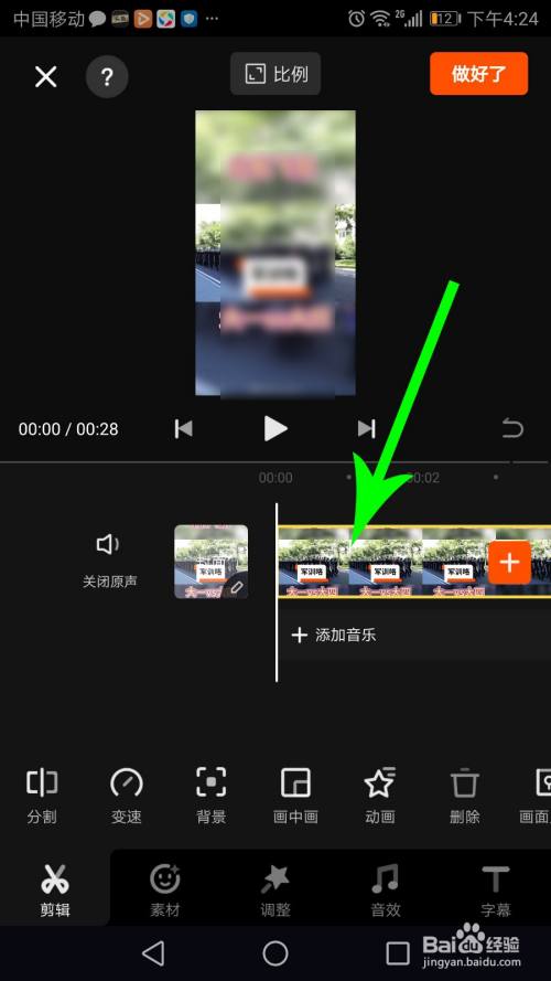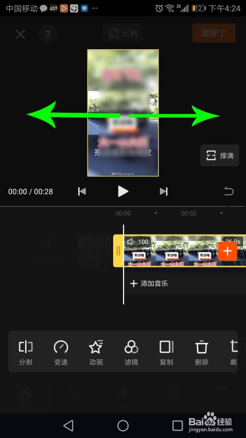 在快影上,首先通过点击的方式选中视频素材,选中之后,使用两根手指按住画面向两侧拖动,即可放大视频画面。