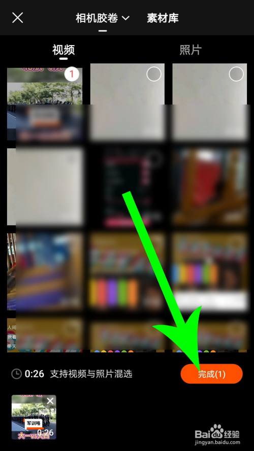 打开相机胶卷界面勾选视频素材,然后点击“完成”。