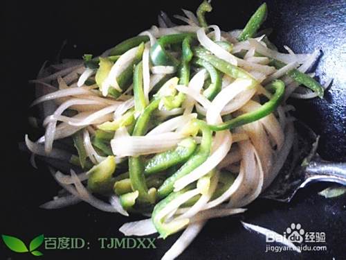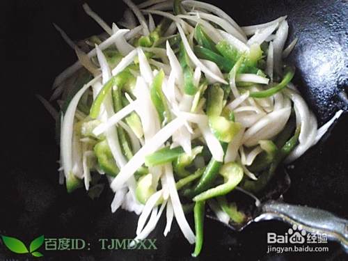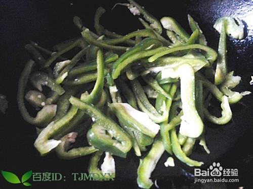 用炒鸭蛋剩下的植物油,倒入切好的皮牙子和灯笼椒进行爆炒一分钟左右。