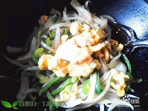 加入之前炒好的鸡蛋,继续一起炒均匀,关火出锅。这里的皮牙子和灯笼椒千万别炒过了,要么会影响口感和品相。