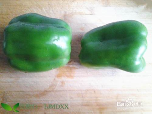 准备2个新鲜的灯笼椒洗净备用。最好是选择灯笼椒头部有分4半的,这样的灯笼椒好吃。