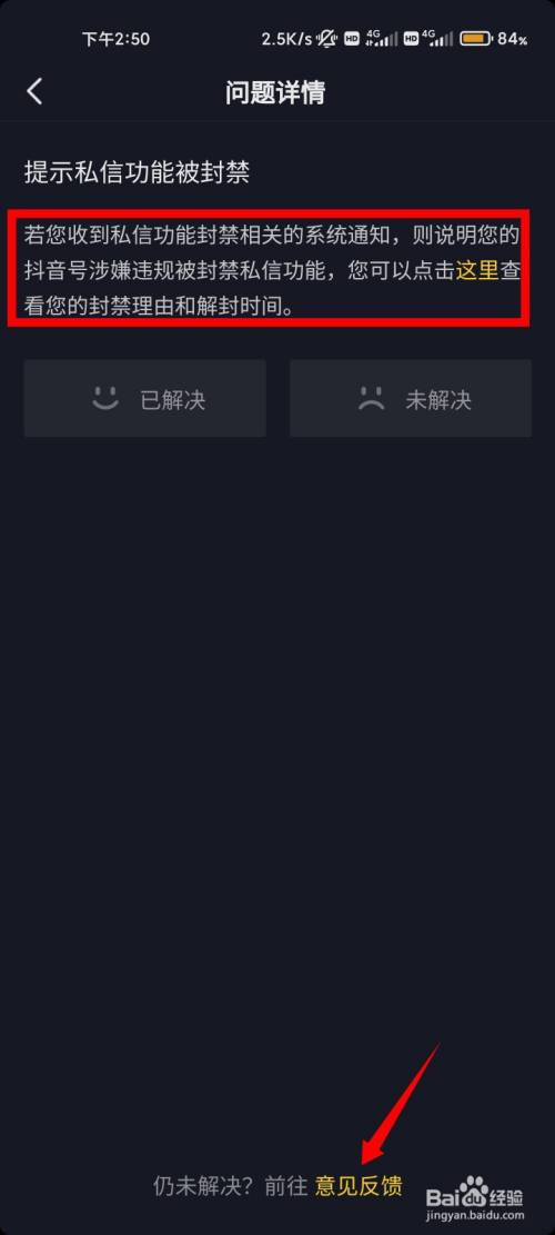 在此页面即可查看私信被封禁的原因,点击底部的意见反馈选项。