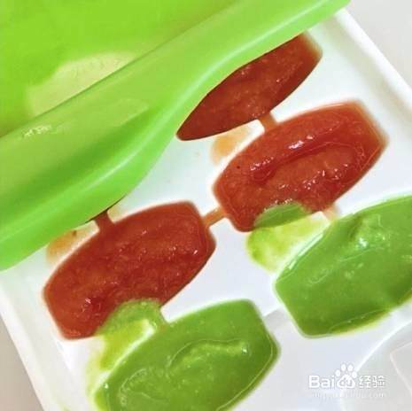 番茄泥和豌豆泥大功告成!分别放入辅食冷冻盒保存,可以混合吃也可以分开搭配别的食材。