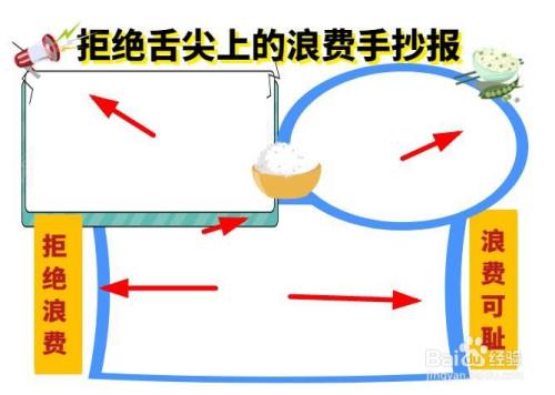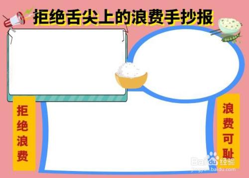 在边框连接处画上各种光盘行动的表现,还有在两边分别用红色字体写上拒绝浪费,浪费可耻,然后给予这个几个字体上黄色,已来让人们警示注意