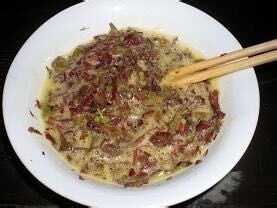 将切碎的春芽放入蛋液中,搅拌均匀。