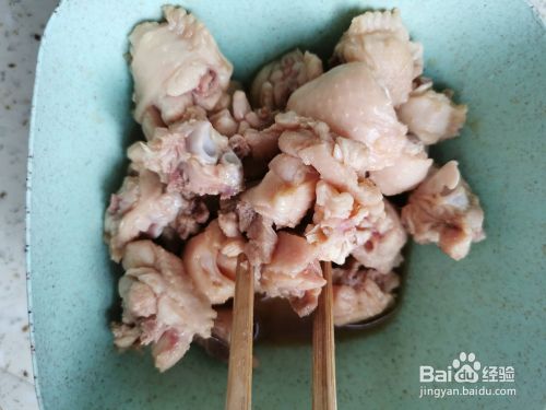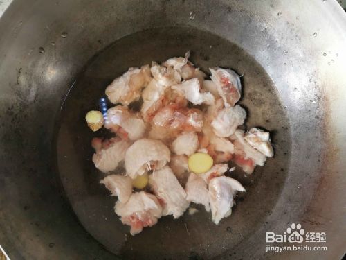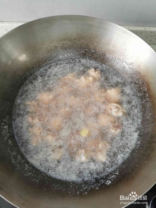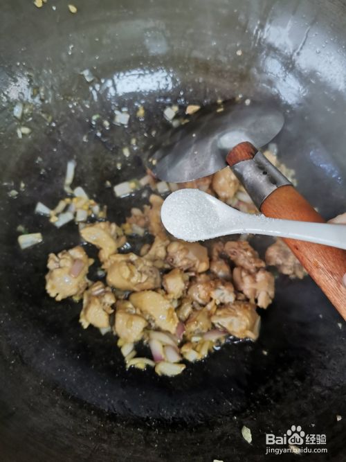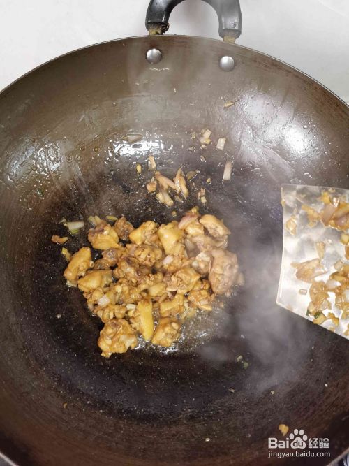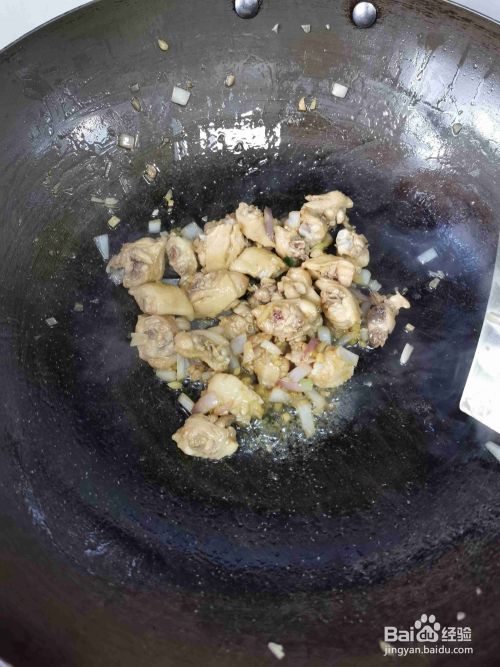下翅中丁炒一会儿,加小半勺盐和料酒炒