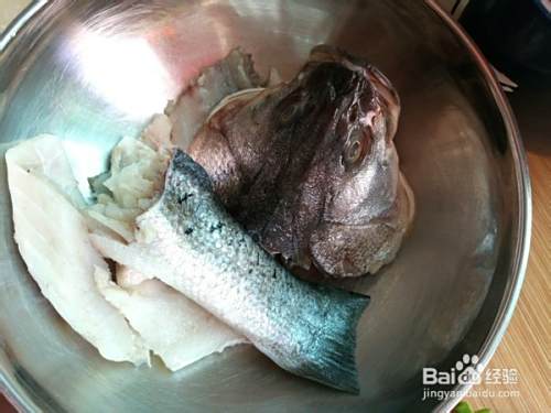 新鲜鲈鱼处理干净后将鱼头和尾部放入碗中