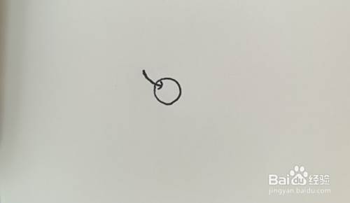 第二步,在刚刚画好的圆圈的里面,靠近边缘的位置,画上一个小小的向上的弧线,然后在弧线的上面,画出一条略带弯曲的曲线,这样一颗小樱桃就画好了。具体如下图所示。