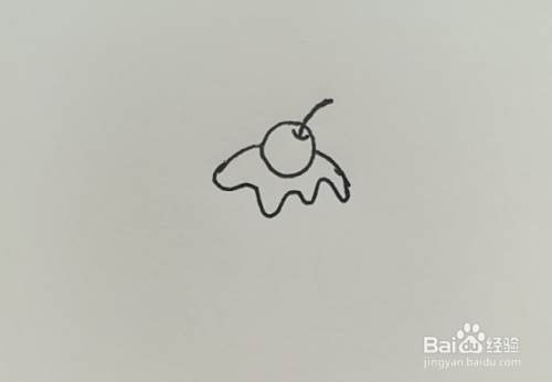 第三步,画完小樱桃之后,接着开始画奶油,在小樱桃的左右两边开始画,画出一条弧线,然后用波浪线连接起来,具体如下图所示。