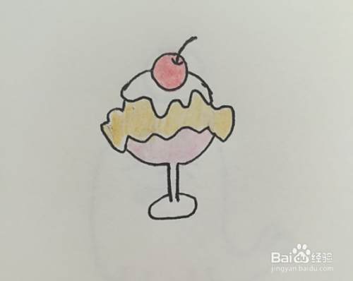 最后一步,就是给甜品涂上颜色,大家可以涂上自己喜欢的颜色,这样一杯甜品冰激凌就画好了,最终的效果图如下,大家有空可以一块来画。