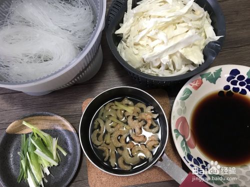把西兰花或卷心菜切成丝,葱切成丝,虾米和粉丝。将虾米放入水中,加入蚝油糖和酱油备用。