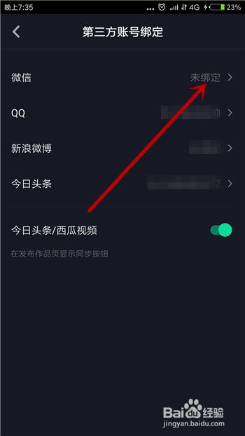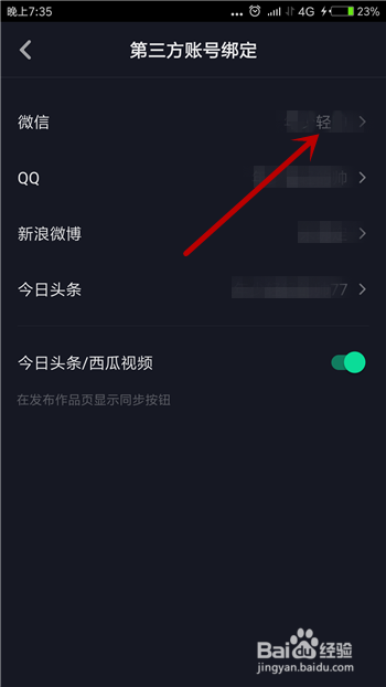 这样再次返回到之前的界面就可以看到抖音中绑定的微信账号了,显示的是我们微信昵称。