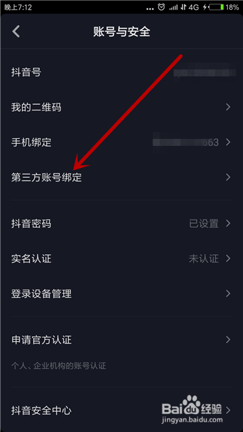 然后在账号与安全界面中就能看到【第三方账号绑定】了,点击这个选项。
