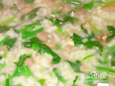 3、把米和猪肝加水熬好,加入菠菜就做好了。