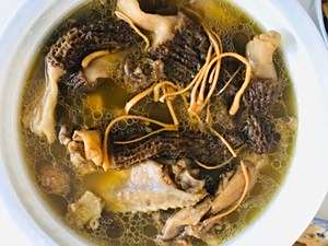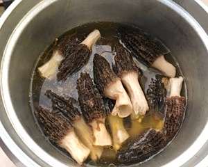 等鸡汤大概煮了有1个小时左右的时候,放入新鲜羊肚菌,盖上锅盖,再煮30分钟左后。出锅前可以先尝一尝盐够不够,如果不够的话再适当加一些,然后多煮一会儿。