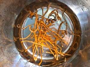 在等待鸡肉沸腾的时候取少许虫草花洗一洗泡水里。(水不用太多,一会儿可以一起倒入锅里)