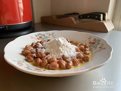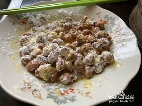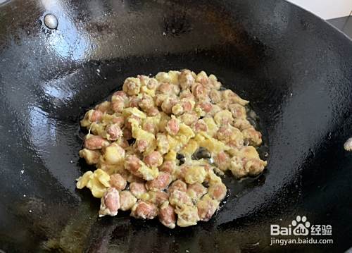 倒入蛋液。转动筷子使花生粘在蛋液上