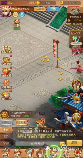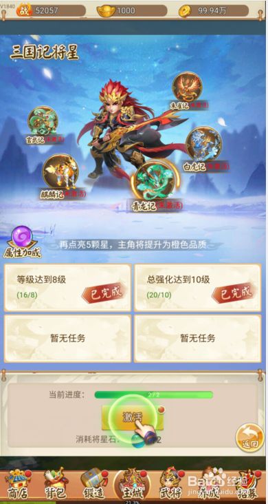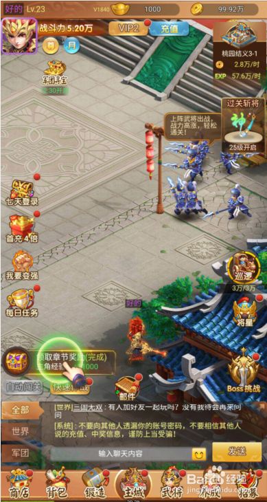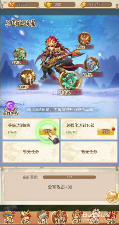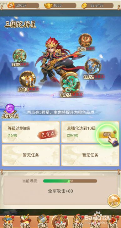 1、打开名酱三国游戏主页,点击完成游戏任务,领取章节奖励。