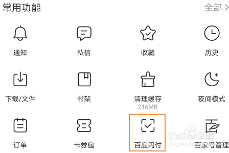 然后在个人中心页面的常用功能里就能看到“百度闪付”了,如下图所示......