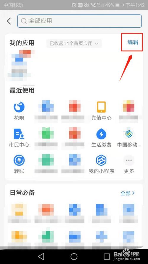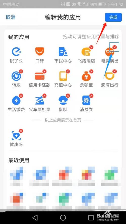 进入编辑我的应用页面,在我的应用下方,找到要删除的应用,然后点击其右上角的删除小图标。可以连续删除多个应用。删除完成,最后点击页面右上方【完成】按钮。